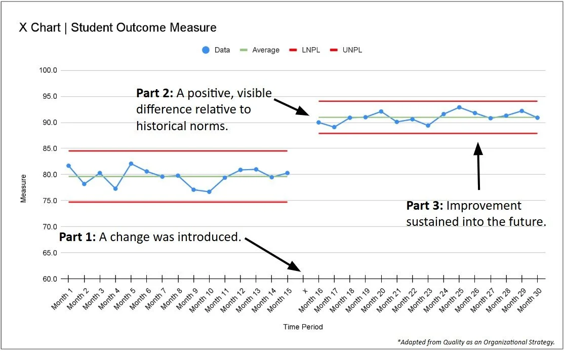 It is clear from this illustration that a claim of improvement has been substantiated with evidence. First, there’s a clear point-in-time when a change was introduced (Part 1). Second, there’s a clear difference in results after the change was introduced as compared to historical results (Part 2). Third, the improvement is sustained into the future (Part 3).